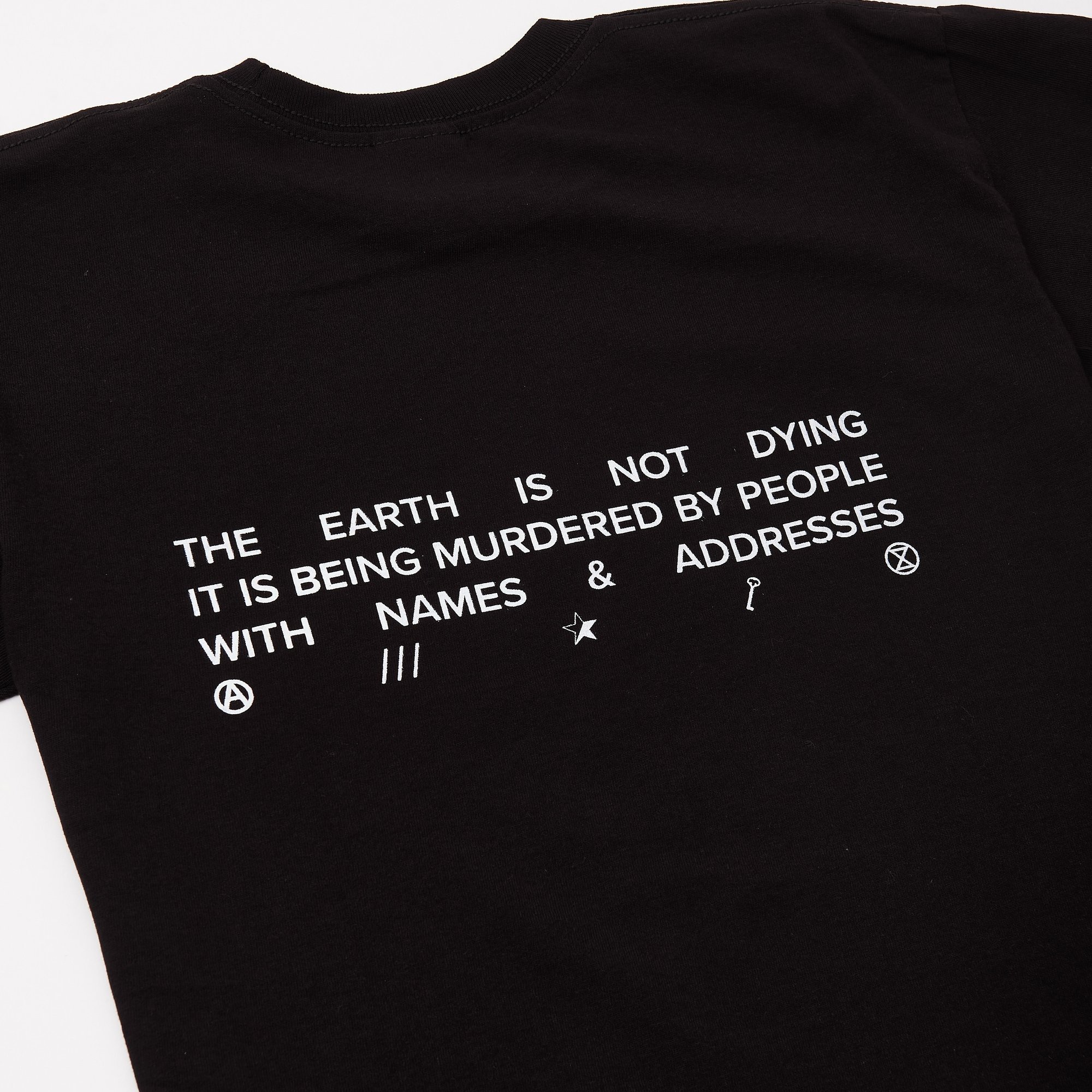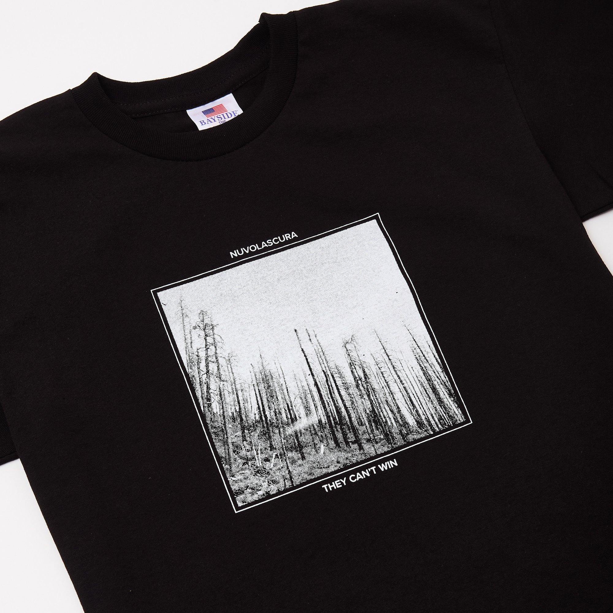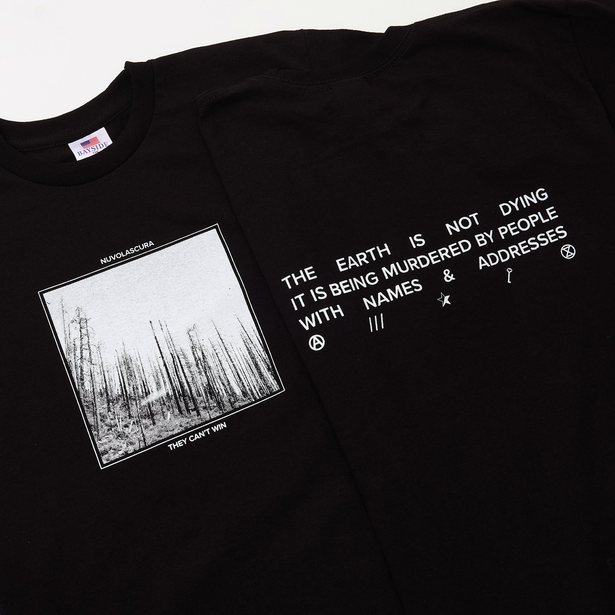 The front design incorporates a photograph of a burn zone near Yosemite National Park, as well as lyrics from our song "Polar Destinies." The back design is inspired by the quote often attributed to Utah Phillips.